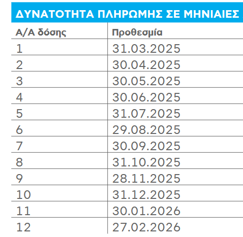 Η πληρωμή του φόρου μπορεί να γίνει εφάπαξ ή σε 12 μηνιαίες δόσεις, με προθεσμία καταβολής της πρώτης δόσης την 31η Μαρτίου.