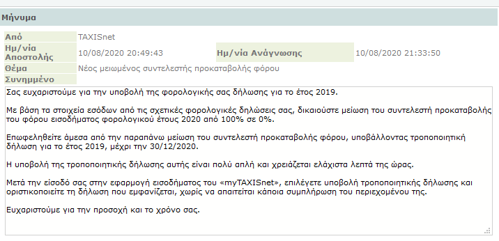 Σημειώσεις TAXHEAVEN: Το μήνυμα που λαμβάνουν οι φορολογούμενοι οι οποίοι έχουν υποβάλει δηλώσεις είναι το ακόλουθο (σ.σ. για περίπτωση μείωσης προκαταβολής από 100% στο 0):